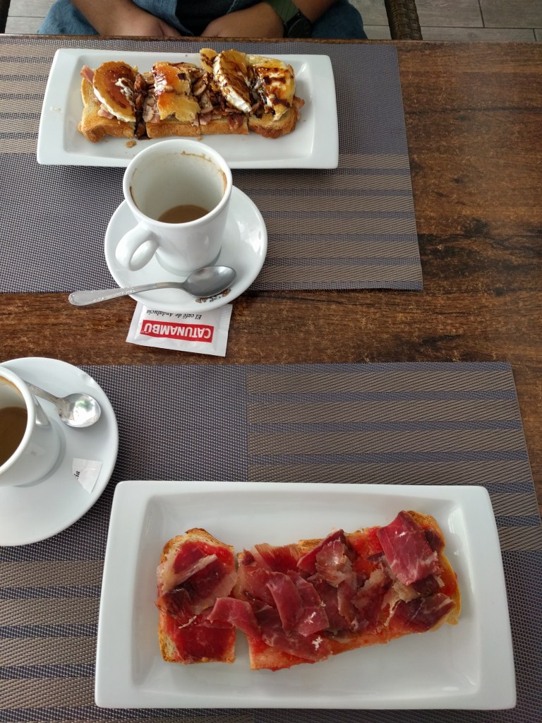 Another way to lose the jet lag fight is to eat at random times – not at proper local-time eating times. Which we did all that next day. Upon waking up we went to a cafe. We got these fantastic open faced sandwiches. We had wanted to try jamon (a dry cured ham leg they just rip bits off of and serve). I ordered an iberian jamon sandwich. It was a bunch of fresh crushed tomatoes on the bread with jamon over the top. Yum. Chris got a goat cheese, balsamic vinegar, honey and bacon mix on bread. Awesome.