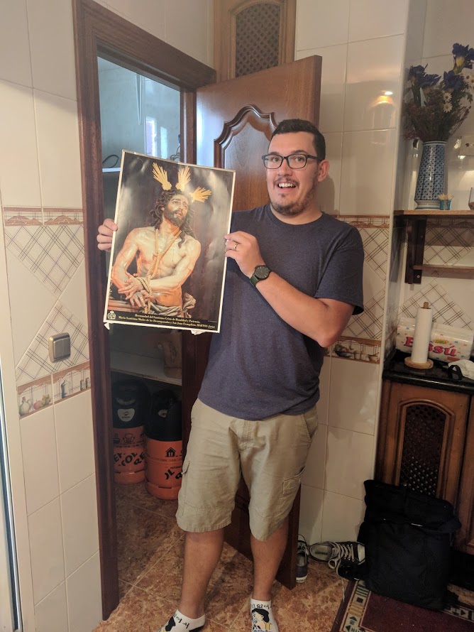 The walls have a lot more holes than we initially noticed. Also there are some intense Saints and the Mother and Child watching over the main bedroom. They live in the closet now (for safe keep). In the pantry we saw a tiny corner of a paper hanging over the edge of a high shelf. Ooo, secret paper. We took it down – surprise Jesus! He watched and and still watches over everything from the top of the pantry. We agree this is the safest place for him so there he remains. Watching over things.
