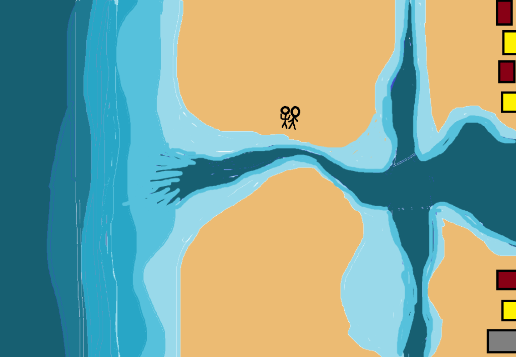 The city is on the right, the ocean is on the left. The river gets flooded by the high tide and it floods back onto the beach. This line of flooding lasts for miles, and is both deeper and wider than it looks in our drawing.
