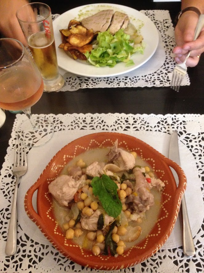 The main course was a choice between tuna steak with fresh sweet potato chips and salad or chicken and garbanzo bean mint stew. Both for us, of course.