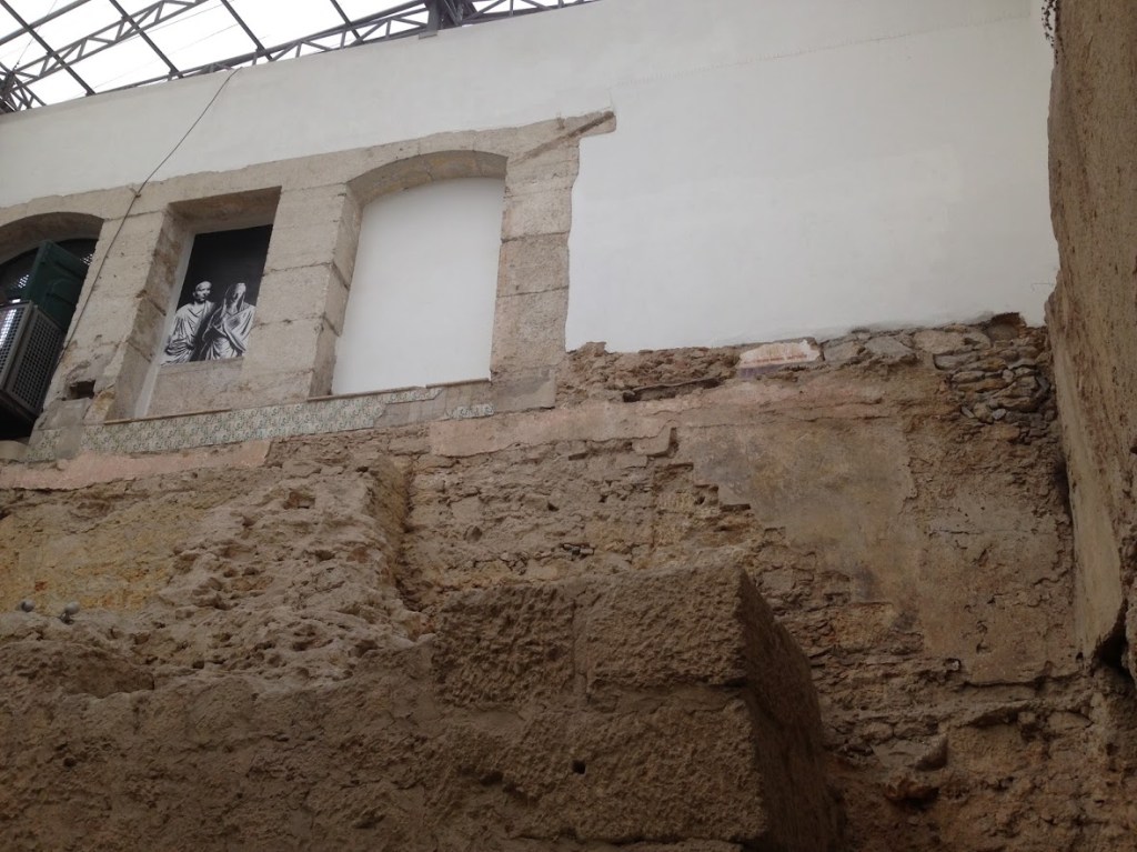 The huge blocks in the foreground are original to the Roman theater while the plaster on the wall behind it is from before the earthquake, then the tile to the left (and plaster off camera) was part of an apartment built after the earthquake. The white walls are modern.