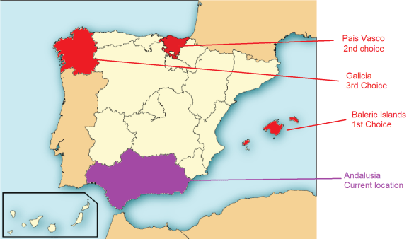 Then in each group you can only select 1 place. Some places are out (crossed out in red) or troublemakers (orange star). Group B is a big disaster because Aragon and Cantabria are notorious for paying really late, quitting the program, or being hard to get into. So that basically only leaves Castilla la Mancha and Galicia as the only reasonable options.