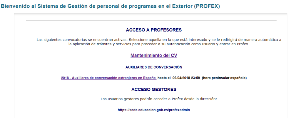 c) You remember how to navigate Profex. If you’re like most people you haven’t been on Profex since you applied last time. Make sure you know where you’ll be going at midnight when the program opens. (Auxiliares de Conversación then from the drop down options choose Presentación Solicitudes)