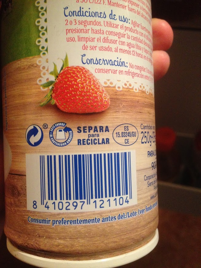 A can of whipped cream that says Al contenedor amairllo and tells you to separa para reciclar.