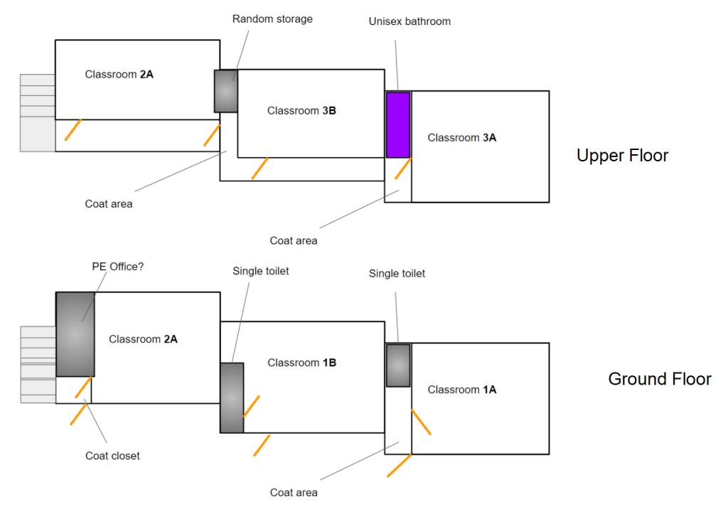 For instance, when you walk down the 6th grade “hall” you walk by B, C then A. Explain that? When you walk to the middle grades you walk by 4B then have to go around behind a corner to 4A then 5A then 5B. So nothing is consecutive at all. It’s not ABC it’s BCA or BAAB. So it messes with my head.