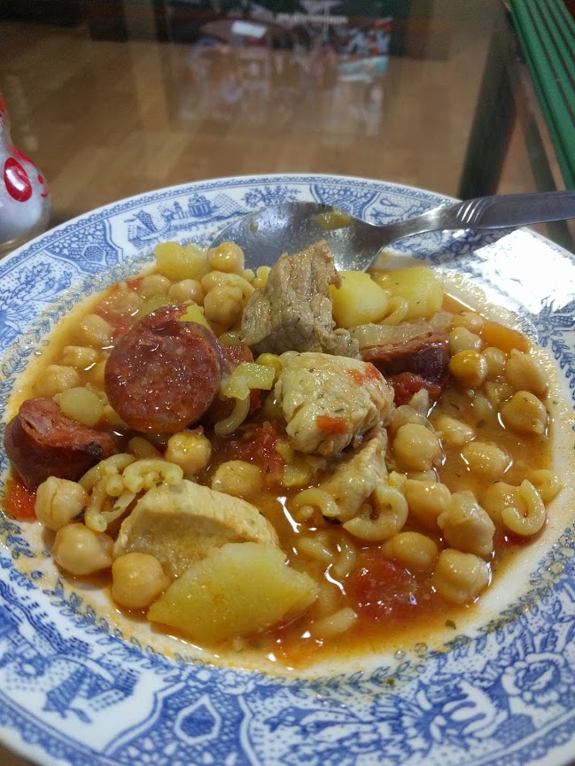 We picked the recipe “Rancho Canario” you would think this would just be Canary Island “Ranch” stew but rancho can actually translate to “mess.” As in mess hall. It’s a recipe designed to feed a small army (or a large family). So Canary Stew-for-an-army. “Rancho” evokes the idea of scarcity or shortage. You needed to be a genius to feed the family – whatever you had would go into the stew.