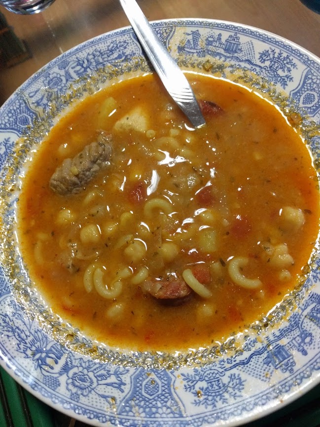 Like all grandma recipes it has no real recipe. Everyone’s grandma makes it differently but here’s the recipe we followed. This is a hearty stew-y thing. It has a triple dose of carbohydrates (garbanzo beans, potatoes and pasta) as well as a triple dose of proteins (sausage, beef, and chicken). By “ranch” they could also be referring to literally everything growing and living on a ranch go into this stew.