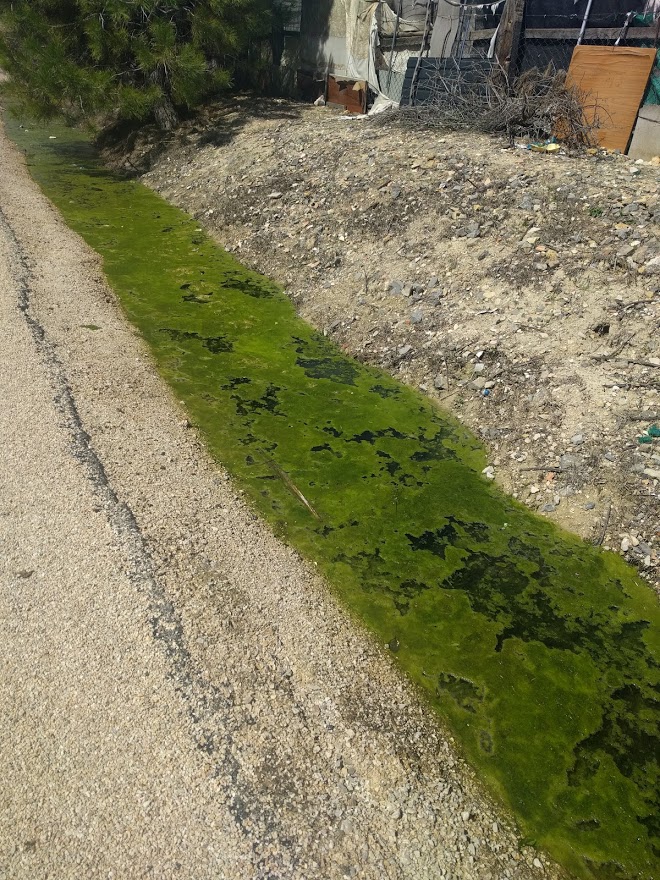 It’s so wet that nothing drained (it can’t drain. Where would it go?). There are honest to god tadpoles living in the gutter – where did they come from?! And it’s looking to be absolutely wonderful mosquito breeding. Here’s some pond scum in the middle of the desert: