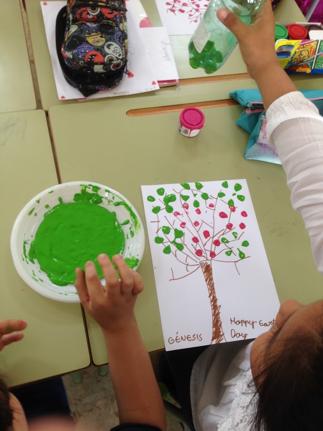 For Earth Day we painted with bottles (with 1st grade). You dip the bottom of a water bottle into green or pink paint – for leaves or cherry blossoms.