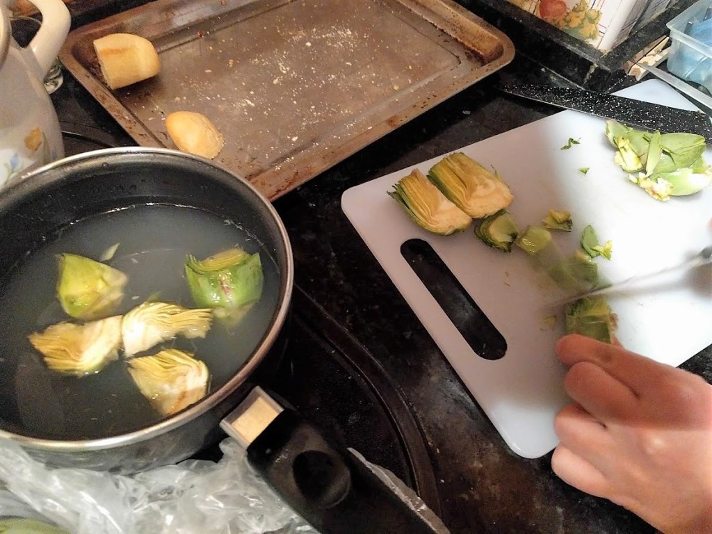 Cut up your artichokes. This one is a bit weird. Slice off the stem and work around it cutting off all the exterior leaves to get to the heart (then divide into 4-8 slices). If you think this is wasteful realize that when you eat artichoke you only eat the last centimeter at the bottom so you’re really not losing any “food” here. If you feel that bad about it, prepare your artichokes, feast on their flesh but keep the hearts. If you live in a country that loves convenience and canned stuff skip all this nonsense and buy a can of artichoke hearts. Strain and rinse all the weird can flavor off.