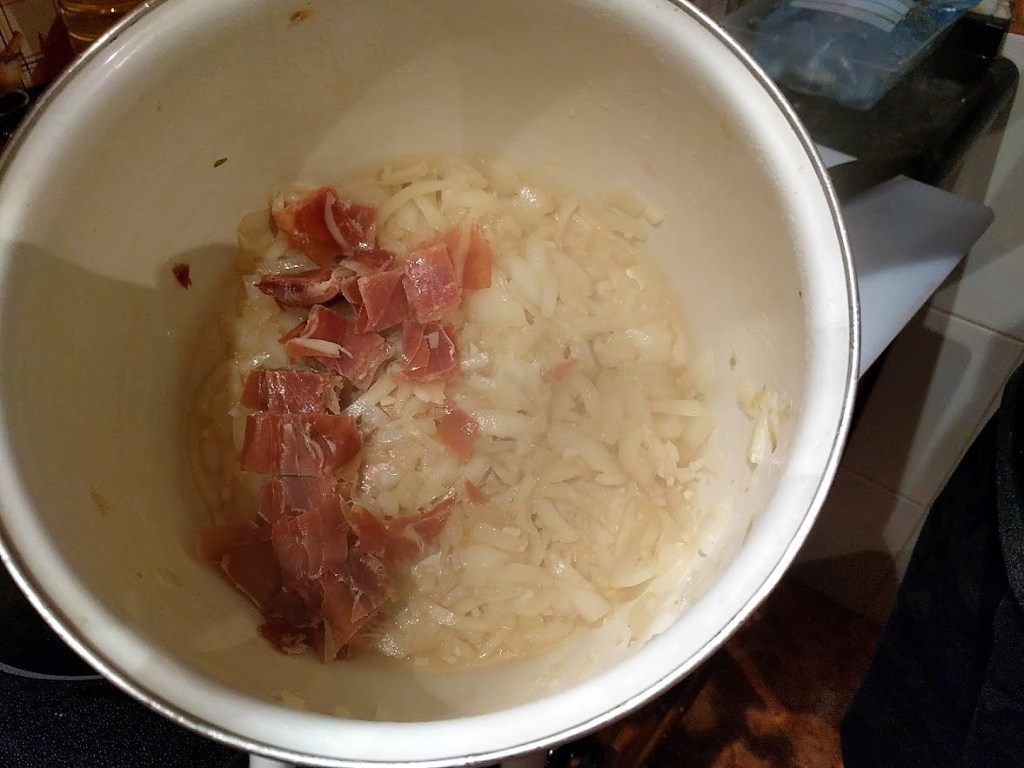 - Saute for about 4 minutes more. The book really wants you to know it’s not possible to overcook the jamon so don’t worry.