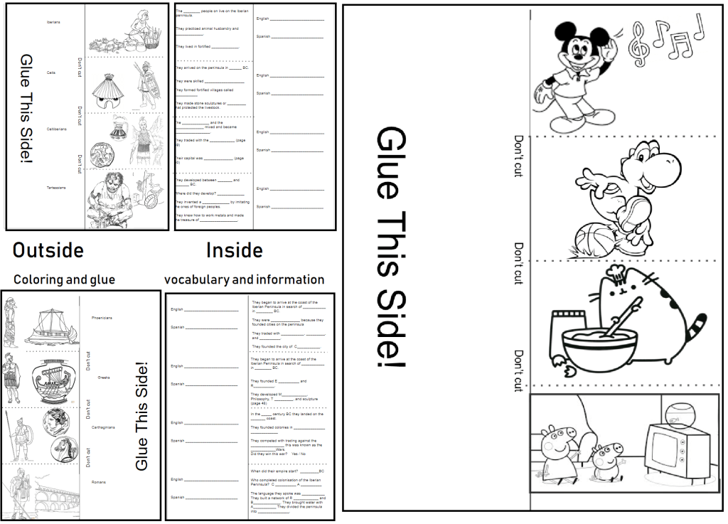 When glued in “correctly” it opens like a cabinet- with both pieces of paper opening outward. You cut flaps so it opens up to contain information or translations. It can be used like flashcards or to contain information about the picture on the outside.