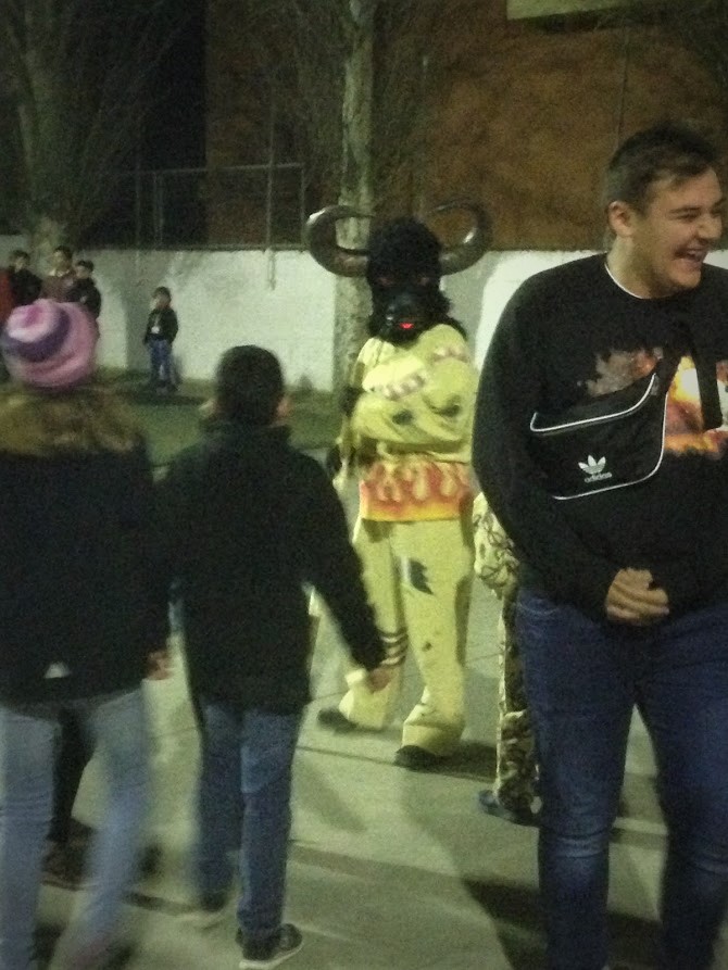It’s quite long and to sing the whole thing takes about 7 minutes. Most people just sing the first couple stanzas and then it’s over. The kids just like to watch the demons dance and to try to ring the bells hanging off of the demon belts. So most of the night was spent with the demons and demons running at the kids (and teens) to scare them. It was good fun, no one was scared or chased who didn’t want to be. Except for maybe the teenagers who at first were too cool to be scared by the demon but ended up running for their lives like the rest of them.