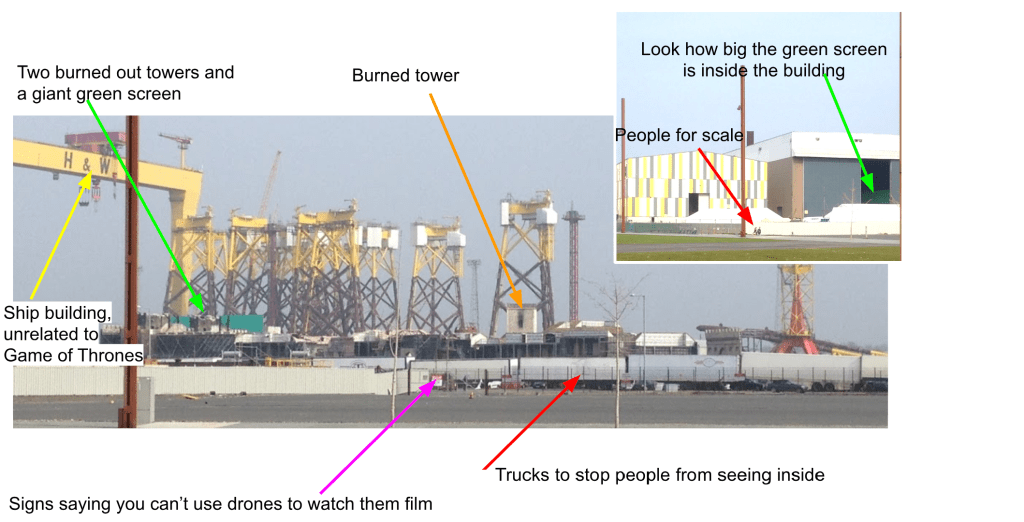 The set next to it/inside of it is an unbelievably big wooden set with all these giant green screens and secrecy. It was maddening because it’s right there. There were all these burned out towers and walls that they haven’t taken down after filming. Why is it burned?!? Oooooo the secrets. We stared for probably 15 minutes discussing.