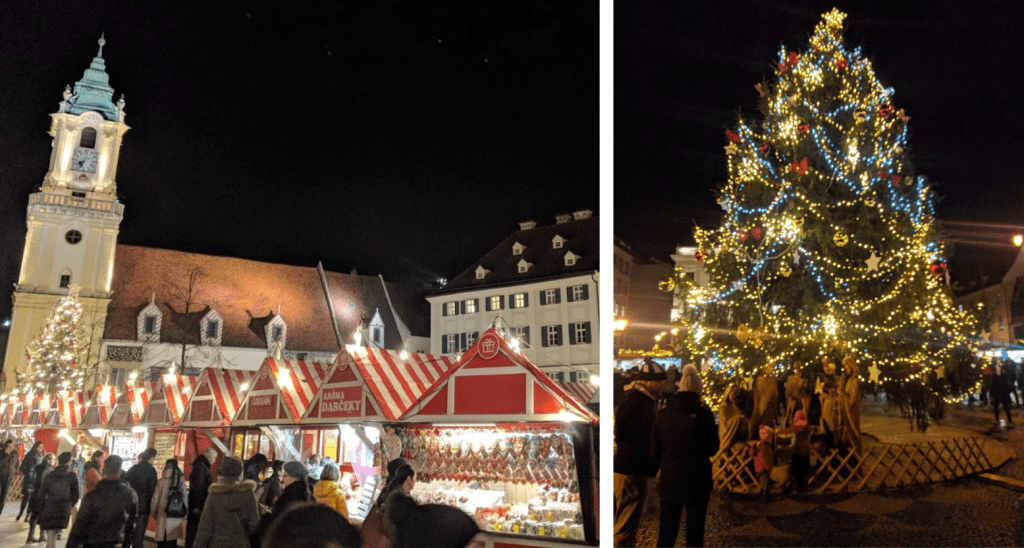 When we arrived in Bratislava we immediately went to one of the Christmas markets there. It was hard to resist because the entire city smelled like delicious sausages and onions. It was wild, the whole walk on the bridge across the Danube we could smell the fatty grilled scent of sausages wafting over from one of the Christmas markets. Bratislava’s tourist website says there are 9 different Christmas markets so we were spoiled for choice. We went to both Hviezdoslav’s Square and the Old Town Hall one but Hviezdoslav’s Square was cheaper and less busy. Euro Trip makes fun of Bratislava saying “it’s a good thing you came in the summer, it gets very depressing in the winter.” But no, it was perfect. The weather was mild, no colder than in Spain at the time (around 8C/46F). The Christmas lights were cheery and they decorated huge trees with Christmas ornaments. The sky is drab but that really just makes it feel more wintery.